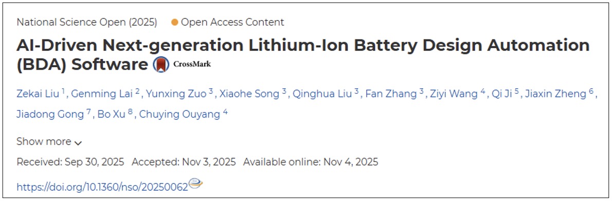 Liu Zekai, Lai Genming, Zuo Yunxing, et al. AI-Driven Next-generation Lithium-Ion Battery Design Automation (BDA) Software (J/OL). National Science Open, 2025, 2025-11-04.