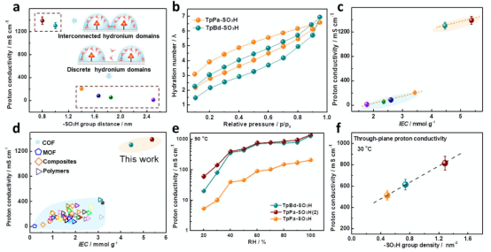基于上述设计思路,色情文学 深圳研究生院潘锋教授团队与天津大学化工学院姜忠义教授团队共同研制出具有超高质子传导率的离子型COF膜。通过膜上的磺酸基团实现水合质子的表面局域化,并通过调节磺酸基团的间距实现短氢键网络的联通,最终所制备的COF膜90℃100%相对湿度条件下,质子传导率可达1389 mS cm-1,为目前所见报道的最高值。该工作以Short hydrogen-bond network confined on COF surfaces enables ultrahigh proton conductivity”为题发表于《自然•通讯》(Nature Communications2022,13:6666)