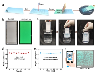 一个是信息加密器件。加密的信息需要满足以下两个条件才能显示:给器件施加交流电;将器件浸入极性液体中,例如自来水中。与普通的紫外加密相比,该加密装置具有更新颖、更好的鲁棒性、可编程性和简易制备等优点,可广泛运用在军事加密、商品防伪以及水下光通信等领域。