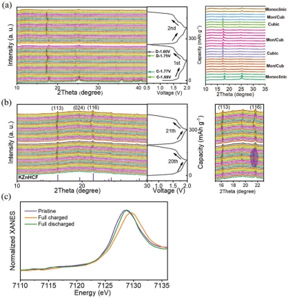 研究团队进一步采用原位XRD测试来可视化相变过程。如图3所示,K2MnFe(CN)6正极在前两圈的循环中并没有出现明显的向K2Zn3[Fe(CN)6]2相的转变,只发生本体的单斜相和立方相之间的相变。但是在第四次循环时,有部分的K2Zn3[Fe(CN)6]2相形成,说明相转变过程并不需要经历很长时间。20圈循环后,XRD结果显示出该材料已经基本完成了由单斜相向菱方相的转变,如图4b所示。原位XRD结果还显示,在充放电的高电压区间衍射峰向大角度偏移,即晶格参数发生了明显变化,特别是在(116)晶面表现得尤为明显,团队推断这可能是由二价Zn2+在该电压区插入引起的强静电斥力所致。此外,对相变后电极的XANES分析证实Fe3+/Fe2+是主要的氧化还原中心。