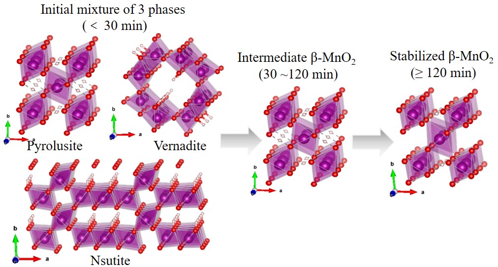 传统的碱性Zn-MnO2电池存在容量衰减快、库伦效率低和析氢副反应严重的一系列问题,因此发展具有优异可充放性能的中微酸性体系Zn-MnO2电池是当前科研界和产业界共同关心的问题。为了尽可能的增加MnO2正极材料的容量,提高循环稳定性,人们针对MnO2正极做了非常多的研究工作,包括调控晶体结构、生长方式、调控电解液等。其中还有的关键科学问题是放电过程中Mn2+溶出、H+/Zn2+嵌入/脱出引起的相转变、层状结构坍塌、电化学惰性副产物生成等均会造成MnO2正极材料容量的快速衰减,这极大的制约了Zn/MnO2电池的产业化进程。在诸多的容量衰减原因之中,H+/Zn2+嵌入/脱出引起的相转变过程被认为是MnO2材料衰减的最本质原因。如能通过晶体结构及形貌的调控设计,得到一种在H+/Zn2+嵌入/脱出中能保持极好结构稳定性的锰氧化物材料,Zn/MnO2电池的循环稳定性就能得到极大提高。