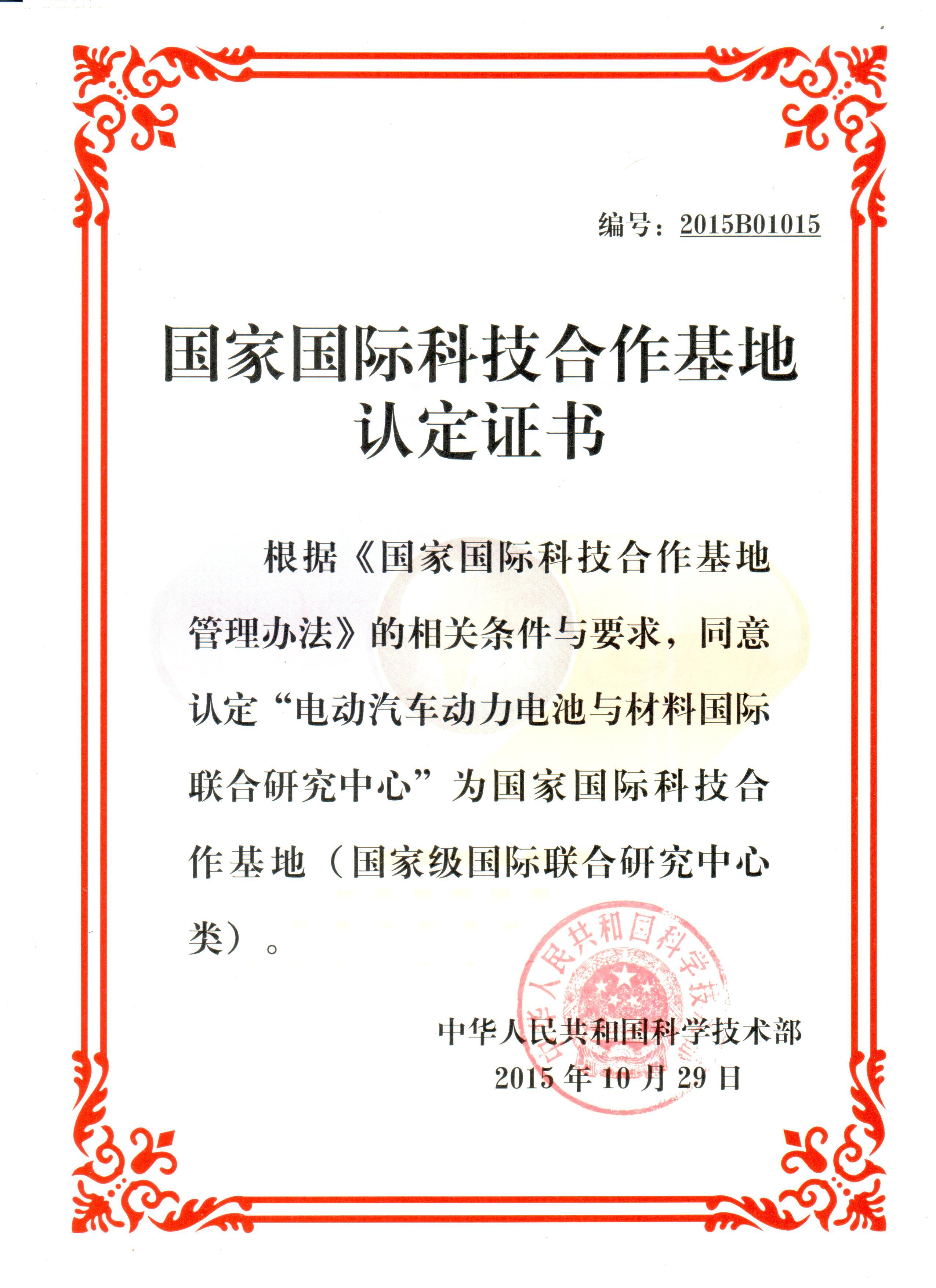 牵头组建的“电动汽车动力电池与材料国际联合研究中心”被正式认定为国家级的研究中心(科技部国科发外(2015)352号文),成为深圳自建市以来的首个国家级国际联合研究中心。