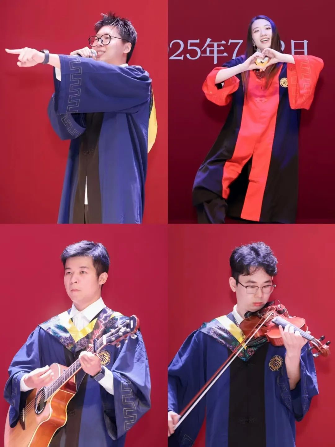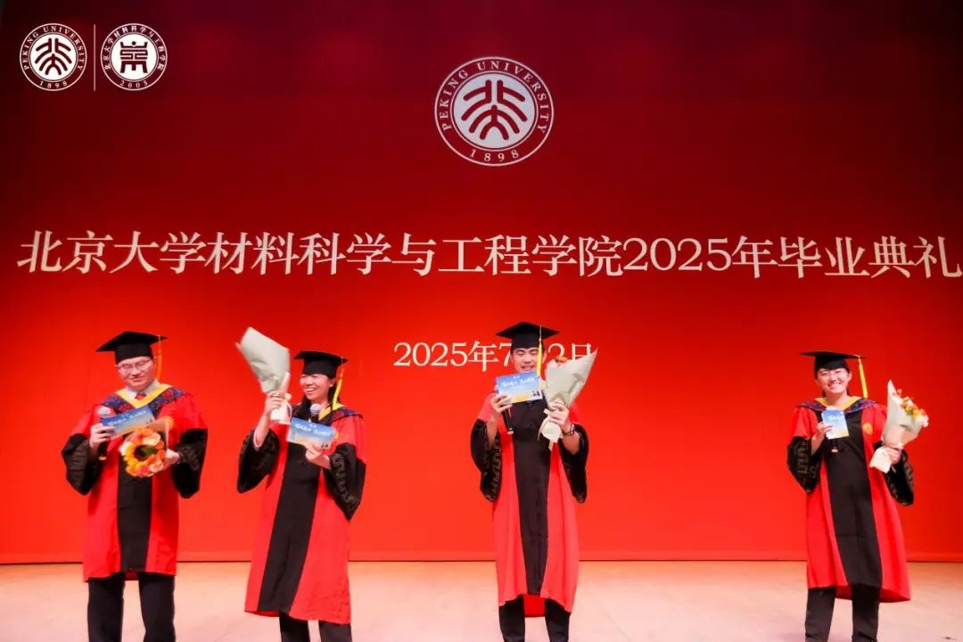 暖场环节结束后,典礼在庄严的国歌合唱中正式拉开帷幕。2025届本科毕业生代表吕振霄、硕士毕业生代表鞠姗姗、博士毕业生代表邓欣雨和赖根明、前沿工程博士毕业生代表王培民通过集体讲述的方式,共同回望了北大材料人在燕园“立志—储能—突围—奉献”的进阶之路。从初心萌芽到锋芒淬炼,每个阶段都在诉说着材料人独有的浪漫,都在坚定地以北大材料之名,答青春时代之问。