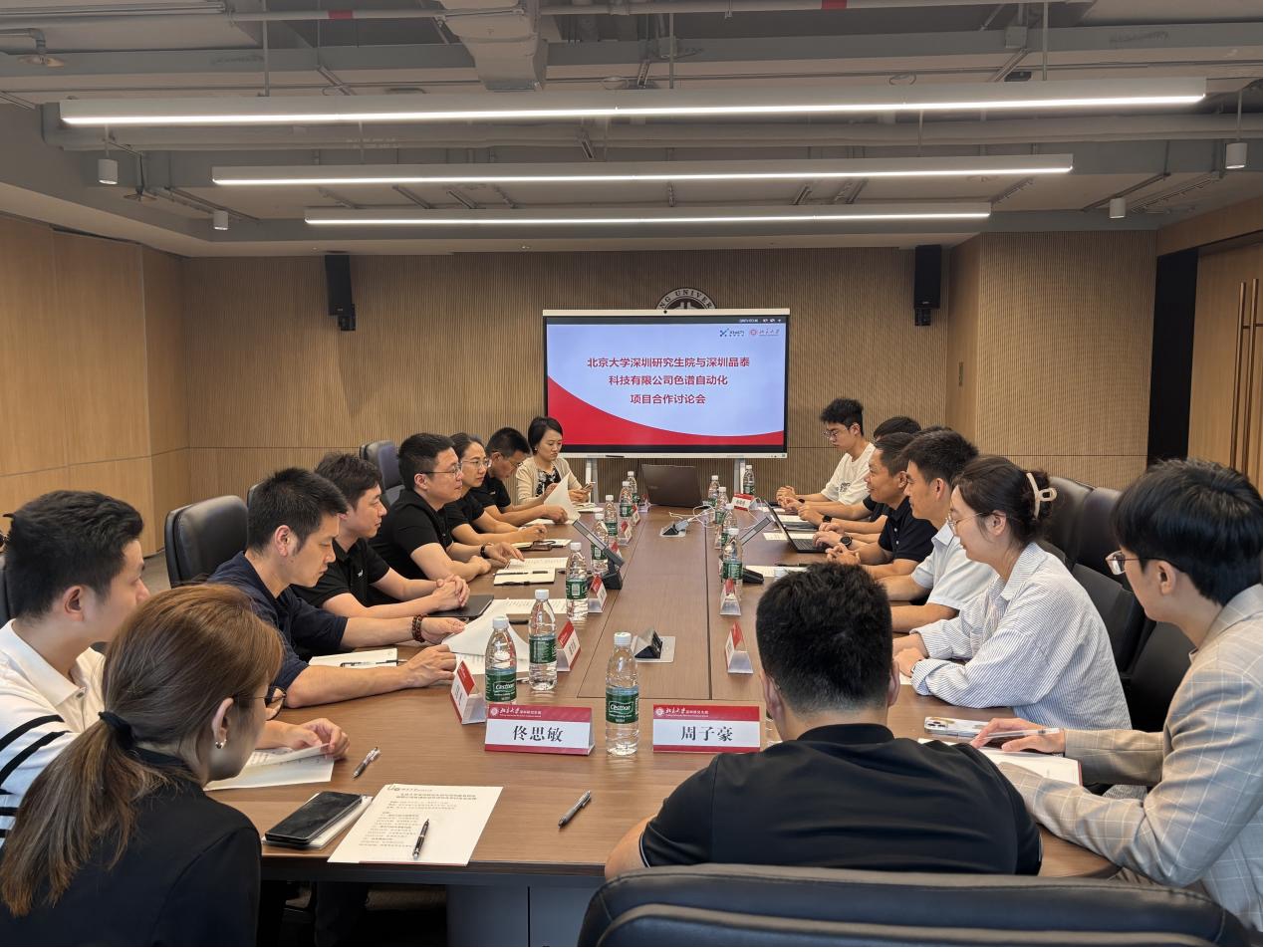 会议伊始,双方领导分别致辞,明确此次合作研讨会目标,表达友好合作愿景。王天兵作开场致辞,介绍深研院在学科建设方面的基础与特色,并表达对双方拟共筑智能实验平台合作意向的充分肯定。马健博士介绍了晶泰科技的发展历程以及公司的未来使命与愿景。接下来,莫凡洋团队详细介绍了其在色谱AI模型构建、复杂样品分析智能决策及自动化色谱平台等方面的创新研究成果,双方展开了热烈的讨论。
