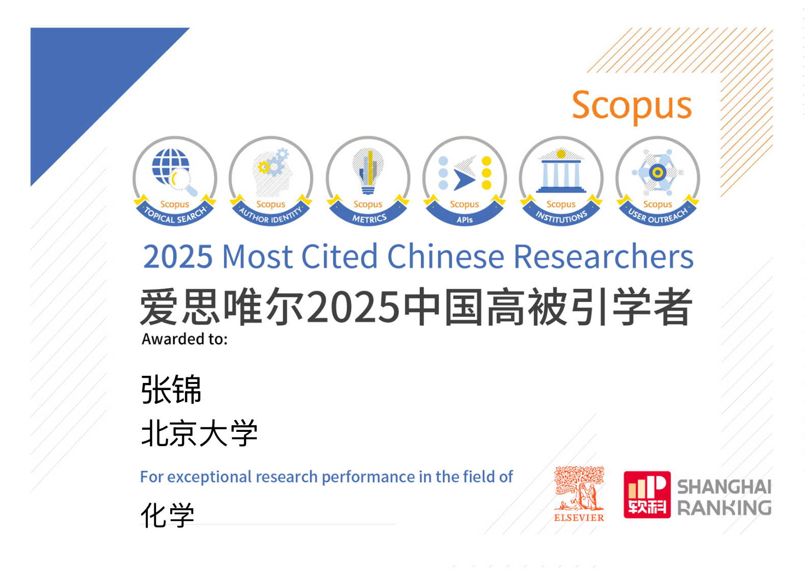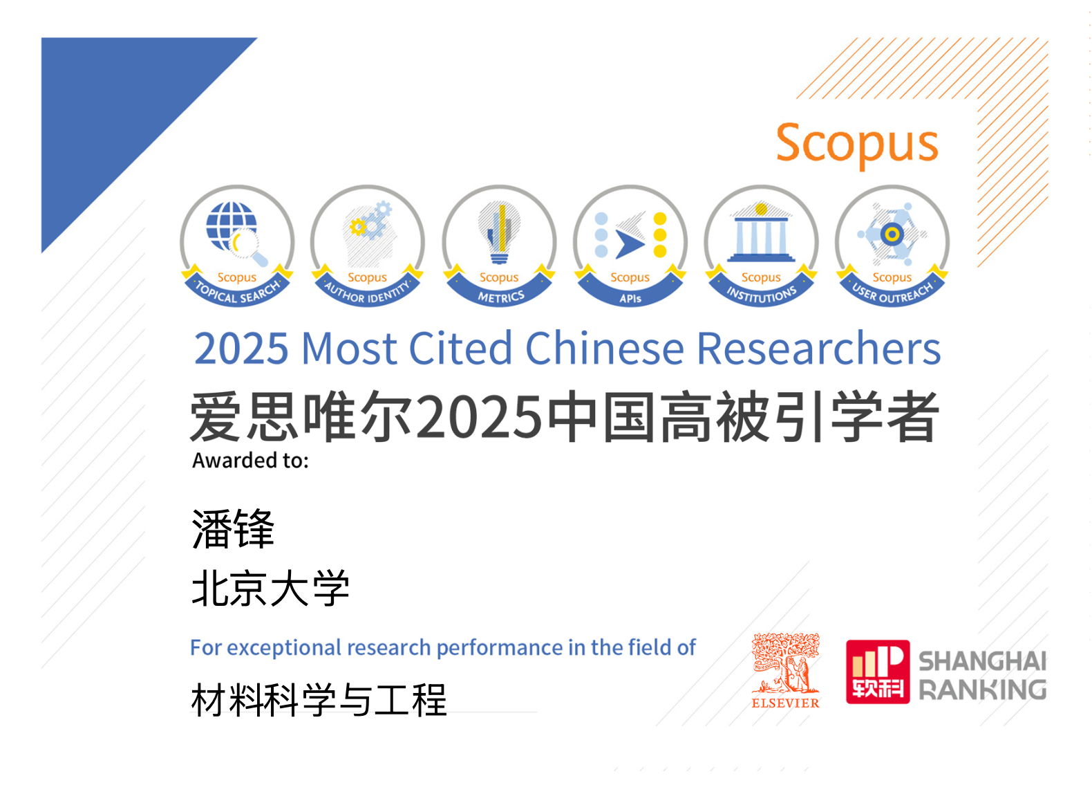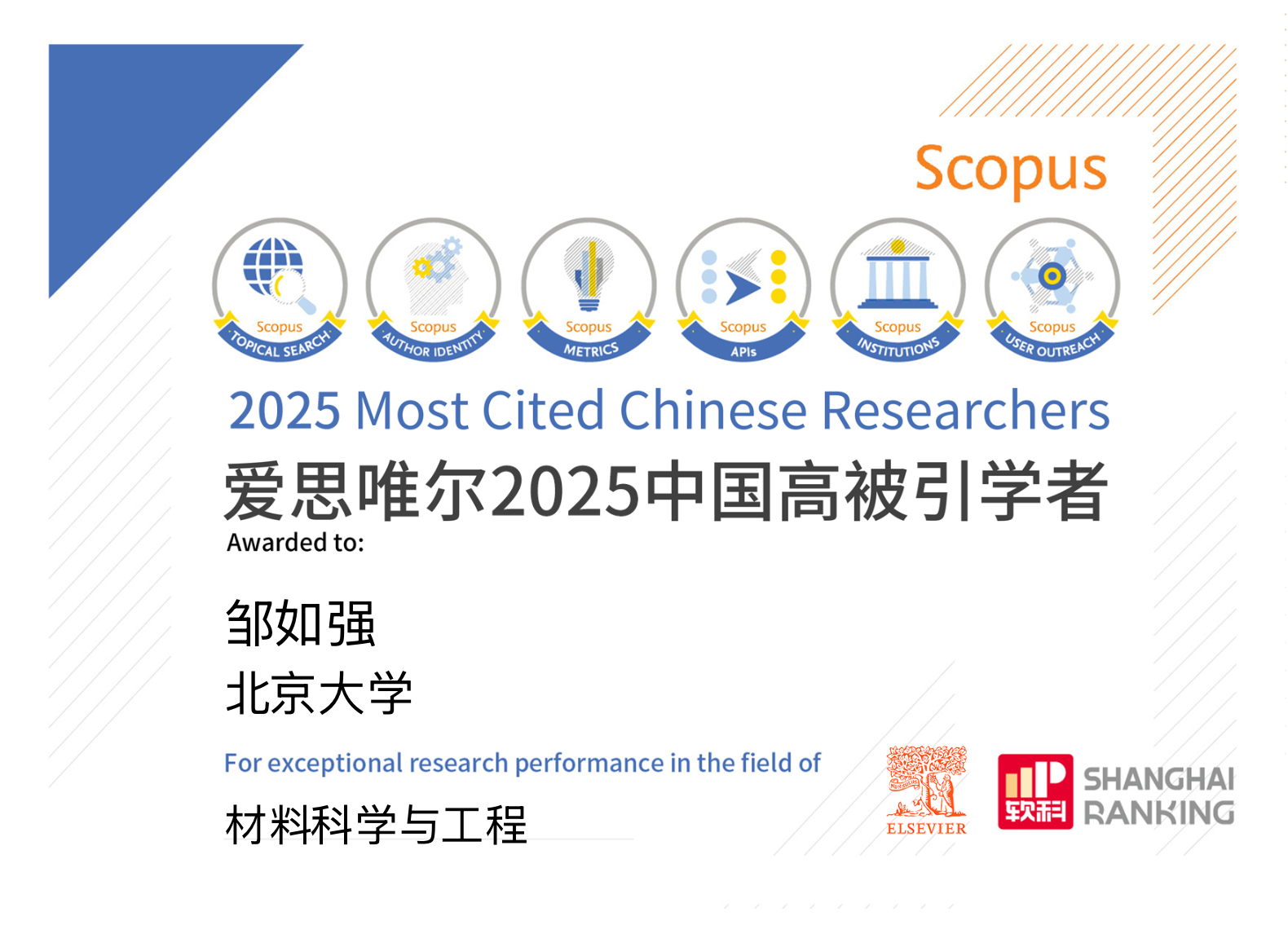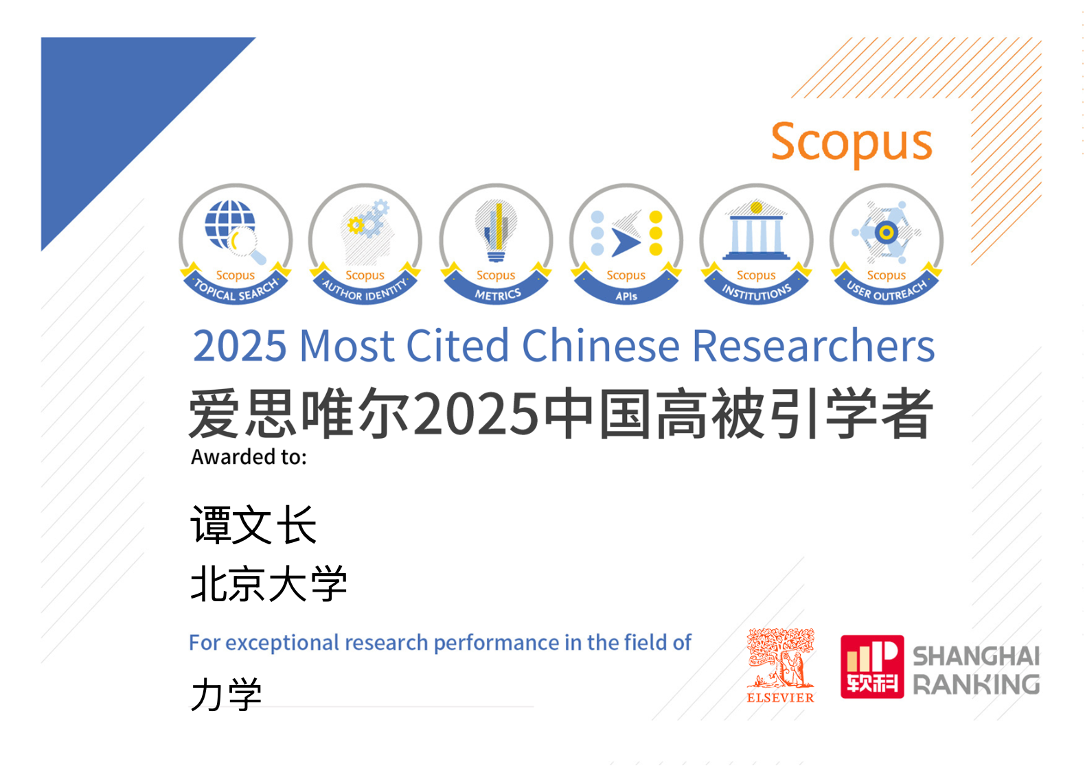 爱思唯尔(Elsevier)“中国高被引学者”榜单是基于全球权威的引文与索引数据库Scopus及上海软科教育信息咨询有限公司开发的方法,对中国学者学术影响力进行系统评估的重要年度榜单。2025年榜单共计6310人,来自543所高校、企业及科研机构,覆盖了教育部10个学科领域、83个一级学科。