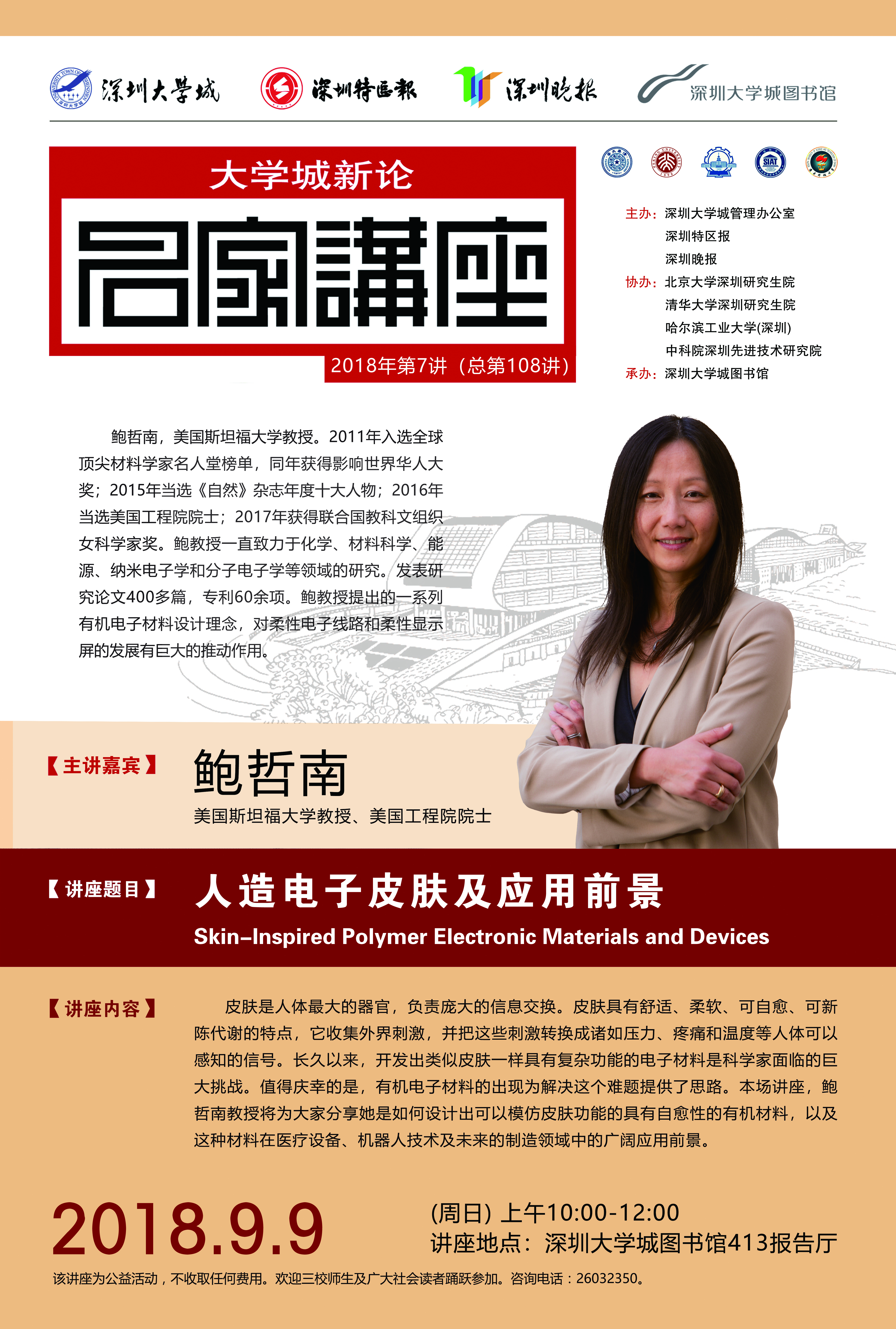 鲍哲南教授,1995年于芝加哥大学获得化学博士学位,随后进入朗讯科技公司贝尔实验室(获杰出研究员称号),2004年进入斯坦福大学化学系任教。2011年入选全球顶尖材料学家名人堂榜单,同年获得影响世界华人大奖,2015年当选《自然》杂志年度十大人物,2016年当选美国工程院院士,2017年获得联合国教科文组织女科学家奖。鲍教授一直致力于化学、材料科学、能源、纳米电子学和分子电子学等领域的研究,涉及能源、有机和高分子半导体材料、传感材料和分子电子器件、纳米电子学等。发表研究论文400多篇,专利60余项,Google Scholar H-Index >110。鲍教授提出的一系列有机电子材料设计理念,对柔性电子线路和柔性显示屏的发展有巨大的推动作用。