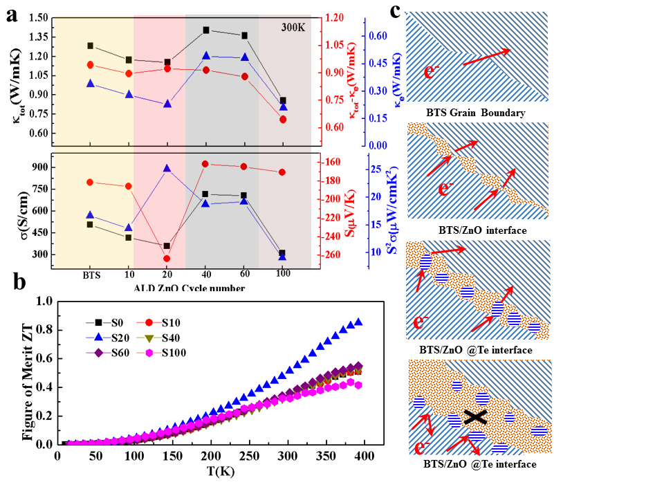图三(a)热电输运特性随ALD ZnO沉积次数的变化趋势(300K)。(b)热电优值。(c)界面结构对热电输运特性的调节的示意图。