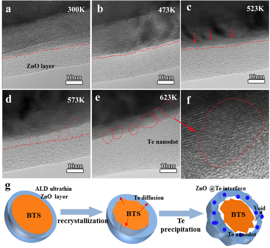 图二 原位升温TEM观测高温烧结过程中Te在Bi2Te2.7Se0.3/ ALD ZnO界面的析出。(a)300K(b)475K(c)523K(d)573K(e)623K. (f)析出的Te纳米颗粒。(g)烧结过程中Te析出的示意图。