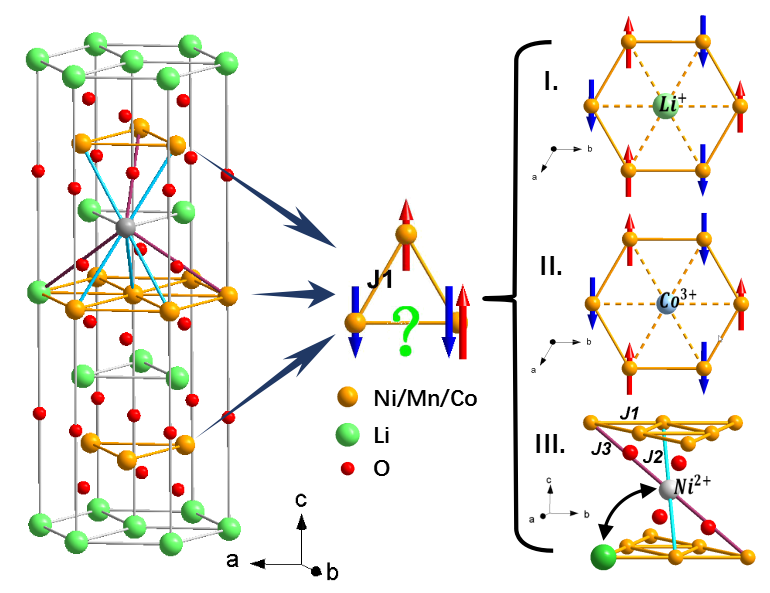 图 2. 三元层状正极材料中的锂镍反位缺陷和过渡金属原子组成的三角晶格结构单元。材料的局域结构由于锂镍反位的出现而发生改变,同时材料的磁阻挫通过不同的途径得到舒缓。
