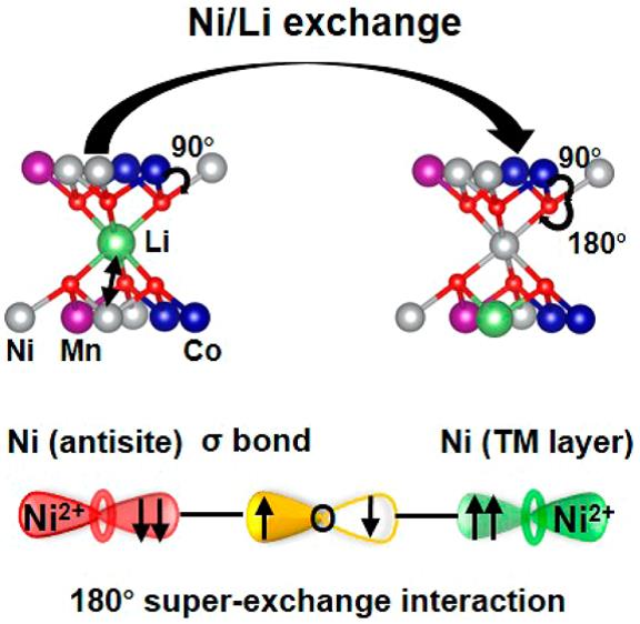 图2. 三元层状材料Ni/Li反位后形成180°超交换相互作用:反位在Li层的过渡金属Ni与不反位在过渡金属层的Ni的自旋电子通过所共同链接的氧原子(O)的电子作为桥梁进行电子“超”交换相互作用。