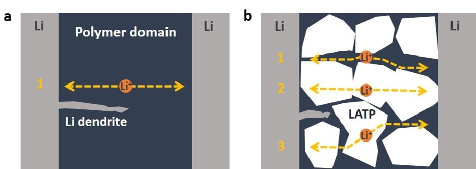图2 锂离子在聚合物固态电解质以及复合固态电解质的传输路径示意图