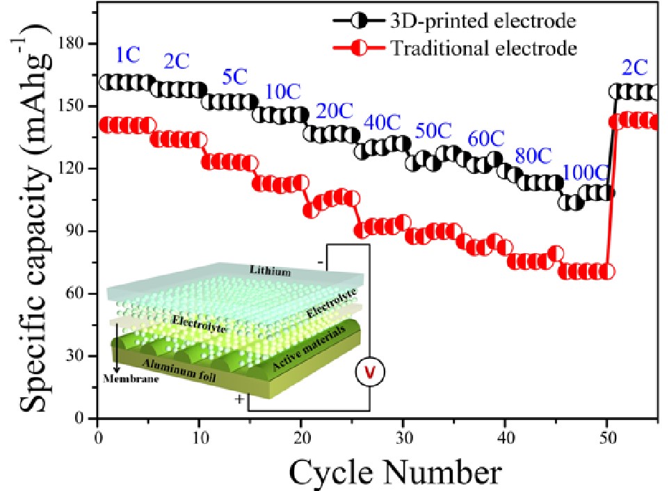 图:(a) 3D打印锂电池正极材料和(b)磷酸铁锰锂电池材料的倍率性能