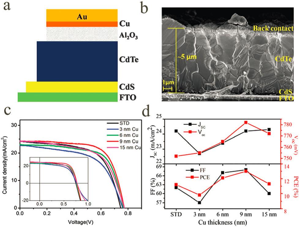 潘锋课题组发现了超薄Al2O3(1-3 nm)可以与Cu反应结合形成p型CuAlO2和Cu2O混合化合物半导体,除了在短距离内(~1 nm)具有良好的天然导电性、减少背接触的电荷界面复合,还可以有效地控制Cu的扩散量。通过构成Cu金属与p型混合半导体的高导电电荷通道,同时p型混合半导体阻挡了Cu的深度扩散,从而解决了背接触的矛盾点,实现了电池转换效率的提高。更为重要的是,该成果可以无缝对接到成熟的CdTe太阳电池生产工艺。