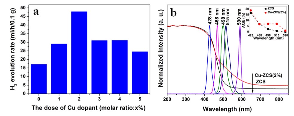 图2. a) Cu掺杂及未掺杂Zn0.5Cd0.5S可见光催化分解水制氢性能比较及b) Cu(2%)掺杂未掺杂Zn0.5Cd0.5S在不同波长LED照射下的吸收性能及量子效率比较。
