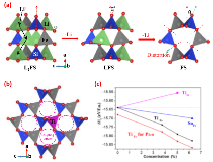 图二:(a)脱锂过程中的结构变化,(b)Ti(IV)耦合效应,(c)计算的掺杂结构形成能。