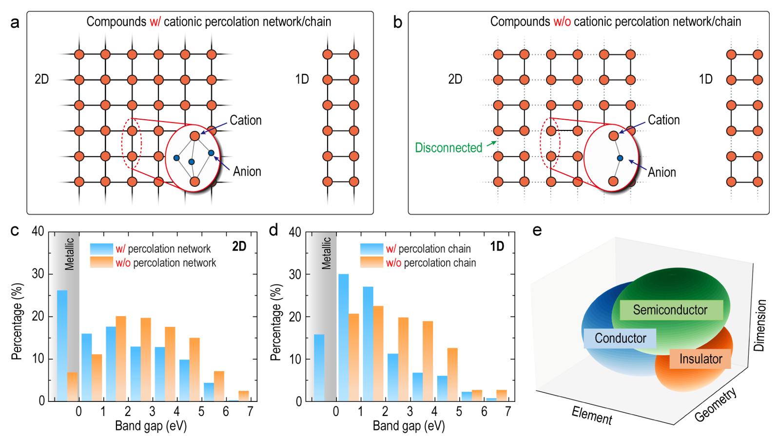 研究团队还根据阳离子配位多面体结构基元所构成的结构图,提出了阳离子渗流网络的概念。该渗流网络中,阳离子配位多面体之间紧密堆积并构成了贯穿材料的联通网络。通过统计发现,结构中存在阳离子渗流网络的二维材料与一维材料均拥有更窄的电子带隙,且一维材料导体较依赖于阳离子渗流网络的出现。该结果表明,通过元素、维度以及拓扑结构特征的优化,可以有效实现低维材料的电子结构调控,从而开发出微型电子器件中所需的导体、半导体和绝缘体材料。