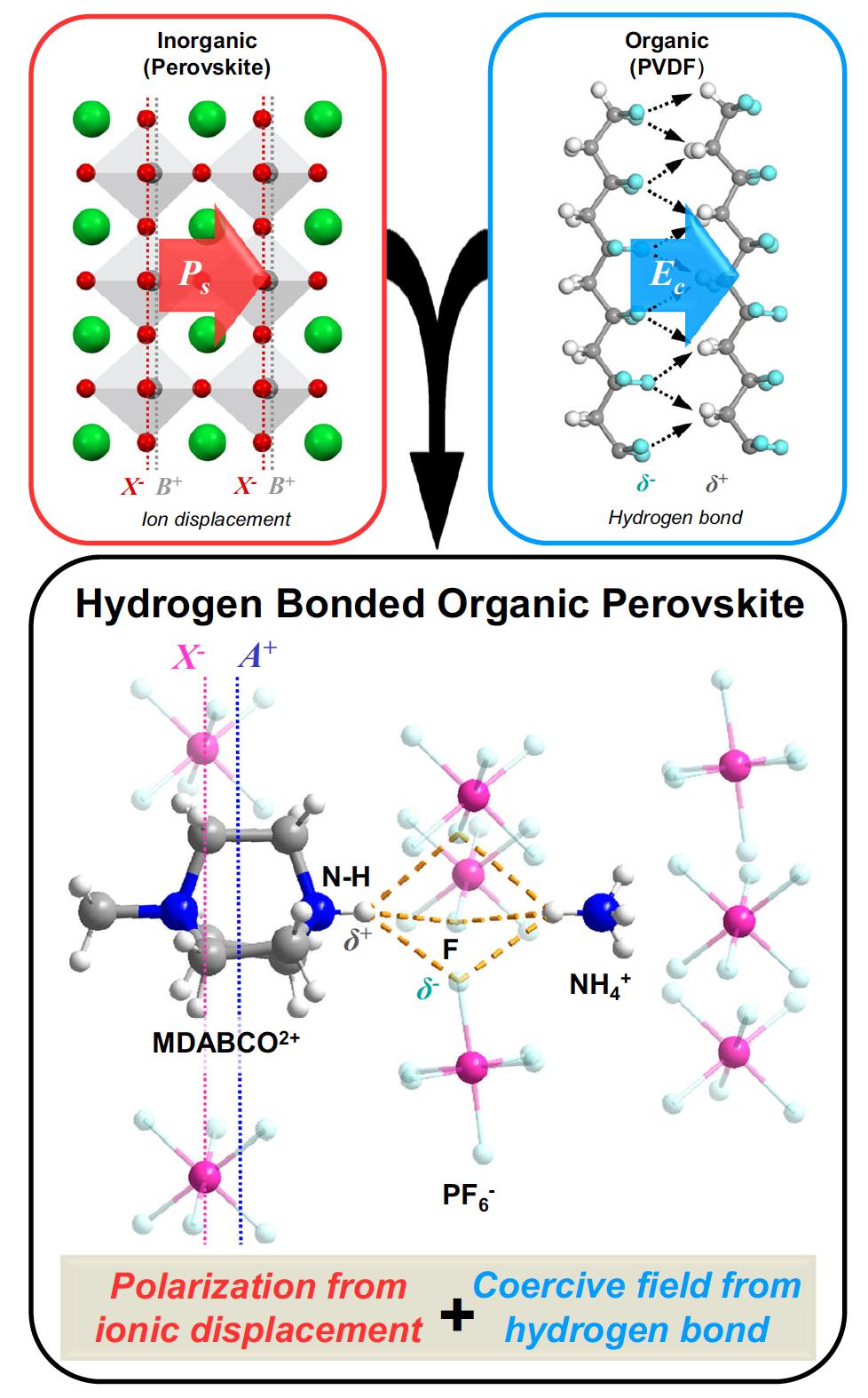 研究团队设计并合成了两种无金属钙钛矿铁电材料MDABCO-NH4-(PF6)3 (MDABCO = N-methyl-N’-diazabicyclo[2.2.2]octonium)和MDABCO-NH4-I3,分别称为MNP3和MNI3。其中,有机分子MDABCO的转动可以实现有序-无序排列的转变,从而带来材料的铁电-顺电相变。测量结果表明,MNP3中的N–H…F氢键距离远低于MNI3中的N–H…I氢键,该氢键导致MDABCO的偏移量高于MNI3。这种氢键作用使材料的矫顽力从MNI3的12 kV/cm提升至MNP3的110 kV/cm,实现了有机铁电材料矫顽力调控的目标。