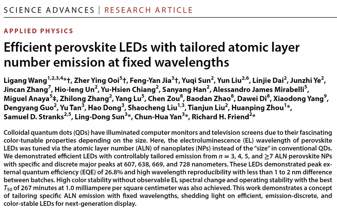 特聘研究员/助理教授王立刚、剑桥大学博士生Zher Ying Ooi及化学学院严纯华课题组已毕业的博士贾凤艳。王立刚特聘研究员、周欢萍教授、孙聆东教授、严纯华院士和剑桥大学Richard Friend院士/爵士为该论文的共同通讯作者。其他合作者来自剑桥大学、浙江大学等单位。该研究得到了英国皇家学会牛顿国际奖学金、国家自然科学基金委、科技部、北京市自然科学基金、欧洲研究理事会等机构的联合资助。