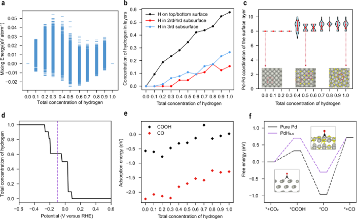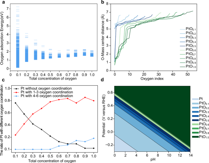 本文通过两个典型体系验证了该框架的有效性。首先,在Pd-H体系中,该方法筛选了超过5万种可能的氢吸附/嵌入构型,并利用机器学习力场计算了不同氢浓度下的活性相分布。研究发现,在电化学条件下,Pd(100)表面经历了由四重空位到六重空位的重构,这一现象被认为与CO2电还原反应的催化活性增强密切相关。其次,在Pt-O体系中,该方法分析了超过10万种Pt纳米团簇的氧化构型,发现随着氧浓度的增加,Pt55团簇内部逐渐形成Pt-O配位结构,导致其氧还原反应活性降低。这一结果与实验观察高度一致。