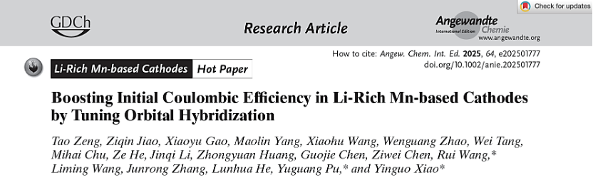 肖荫果团队在国际学术期刊《Angewandte Chemie International Edition》上发表题为“Boosting Initial Coulombic Efficiency in Li-Rich Mn-based Cathodes by Tuning Orbital Hybridization”的研究论文,该成果被期刊遴选为热点论文(Hot Paper)。富锂锰基正极材料因其阴离子氧化还原反应所提供的高比容量优势,被认为是下一代锂离子电池的关键材料。然而,该材料在首次充电过程(>4.5 V)中存在的晶格氧不可逆流失、过渡金属迁移及表面结构重构等问题,导致初始库仑效率低下、电压持续衰减和容量衰退,严重制约了其实际应用。