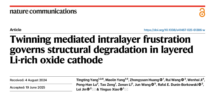 肖荫果团队联合德国于利希研究中心在国际知名期刊《Nature Communications》上发表了题为“Twinning mediated intralayer frustration governs structural degradation in layered Li-rich oxide cathode”的研究论文。该工作创新性地采用原位工况中子衍射与扫描透射电子显微镜多尺度关联分析方法,揭示了石墨||LRM 软包全电池工况下LRM氧化物的微观结构退化机制。该组合手段不仅实现了实时相分数/特征结构参数解析,还能在大视场范围内进行取向、缺陷与应变分布映射。研究发现,初始LRM颗粒呈现部分有序的类Li2MnO3固溶体相,并存在多种取向结构畴与平面缺陷。随循环进行,在不可逆Li+层间迁移与过渡金属层内重排驱动下,材料逐渐从有序单斜相逐步转变为无序菱方相。尤其是在首次完全充电后,形成了层间类孪晶结构和局部层内阻挫。随着循环次数增加,层内阻挫进一步演变为颗粒内部沿{012}孪晶界的颗粒内部孔洞微结构,最终破坏层状框架并阻碍Li+扩散。与传统理论将容量/电压衰减归因于宏观相变不同,本研究首次揭示“孪晶介导的层内挫折向孔洞化缺陷演进”是富锂正极性能衰退的决定性因素。