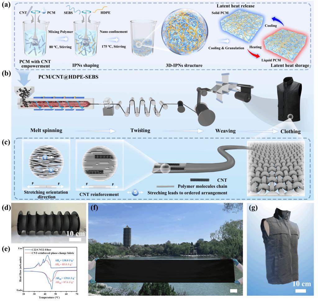 该研究将微量碳纳米管(CNT)作为“纳米骨架”和“异相成核剂”,与三维互穿聚合物网络(3D-IPNs)进行一体化设计,为相变材料(正二十二烷)搭建一个兼具“刚性支撑”、“高速热通道”和“弹性限域空间”的微观结构。CNT作为“定向增强元”,在熔融纺丝和拉伸过程中,能诱导聚合链和相变分子(正二十二烷)高度取向排列,不仅大幅提升了纤维的力学强度和轴向导热能力,还促进了更完善的结晶,从而提高了储热密度。3D-IPNs作为“纳米限域体”,在纳米尺度上构建了坚固且富有弹性的笼状结构,将相变分子牢牢束缚其中,从根本上解决了固-液相变中的泄漏问题,确保了材料在长期循环中的形态与功能稳定。