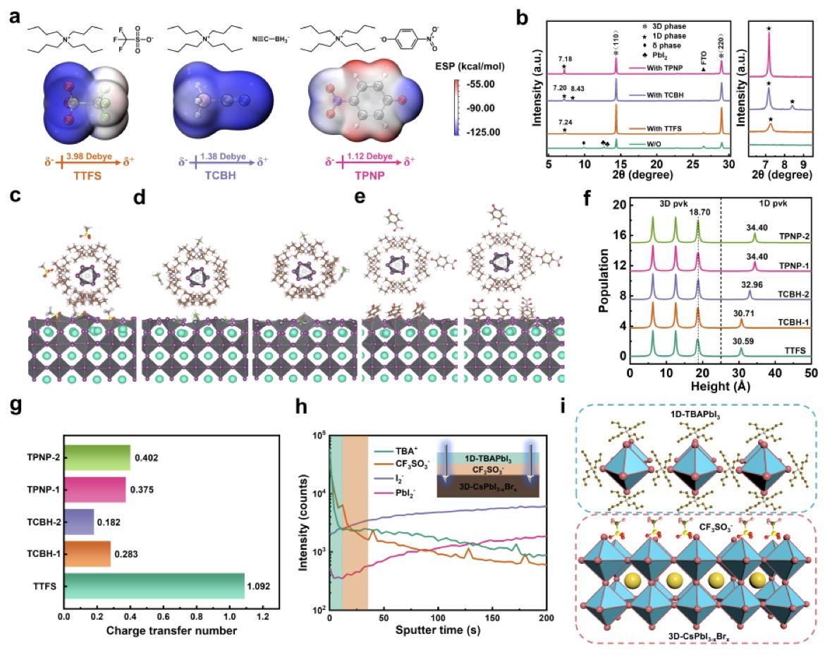 全无机钙钛矿太阳能电池因其优异的热稳定性和光照稳定性而备受关注,但湿气诱导的晶格坍塌与界面缺陷富集两大问题长期制约其效率及环境稳定性的提升。针对这一挑战,研究团队提出了一种“阳离子屏障-阴离子钝化”的协同新策略。TTFS分子中的四丁基铵阳离子(TBA⁺)在钙钛矿表面原位自组装,形成致密的疏水性1D-TBAPbI₃保护层,有效阻隔水氧侵蚀;三氟甲磺酸根阴离子(CF₃SO₃⁻)则分布于次表面区域,通过强配位作用精准钝化未配位的Pb²⁺缺陷,显著抑制非辐射复合。第一性原理计算表明,这种1D/3D异质结具有最小的界面间距和最大的界面电荷转移,从而构建了快速的电子提取通道,克服了传统低维钝化策略中稳定性与电荷传输效率之间此消彼长的矛盾。