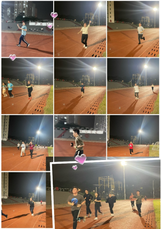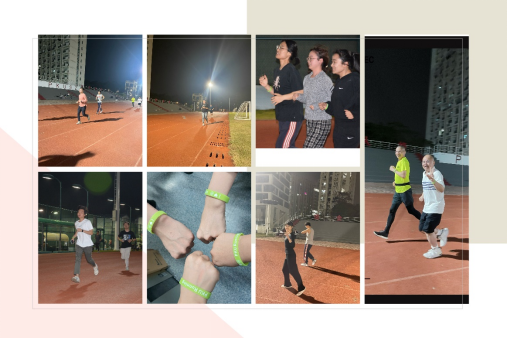 晚风缓缓吹动衣角,师生们在微湿的跑道上奔跑前行,音乐的律动给我们的步伐打着节拍,手腕上的荧光手环在交错挥舞着。大家迈起矫健的步伐,有人一路领先,有人紧追不舍……