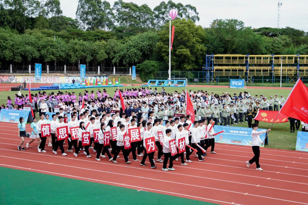 开幕式上, 2025级新生组成的方阵统一身着学院文化衫,迈着整齐有力的步伐步入运动场,尽显新材料学子朝气蓬勃、昂扬向上的青春风采。方阵表演巧妙融入活力十足的舞蹈元素,队员们随着音乐节奏跃动自如,将青春的朝气与科创的锐气完美融合。在“慎思笃行常为新,鹏程万里展新材”的嘹亮口号声中,方阵队伍气势如虹、步伐铿锵,赢得了现场阵阵掌声。