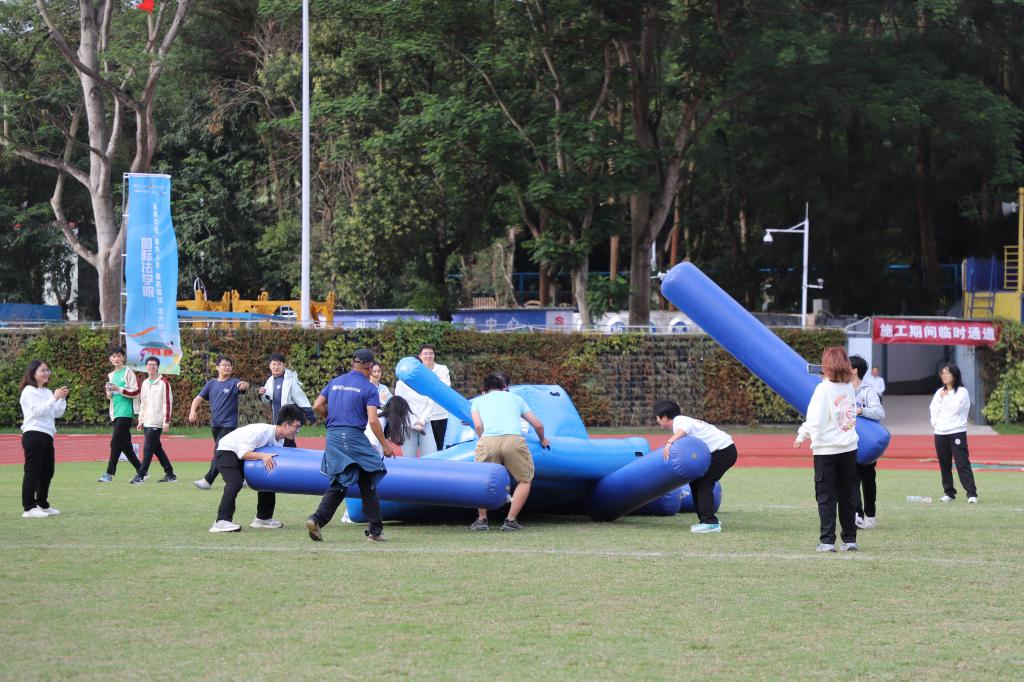 该项目要求队员们共同操控大型“毛毛虫”道具在跑道上快速行进。面对道具操控的难度,大家前后呼应、迎难而上,在欢声笑语中带领象征团结的“毛毛虫”奋勇向前,成功冲过终点。